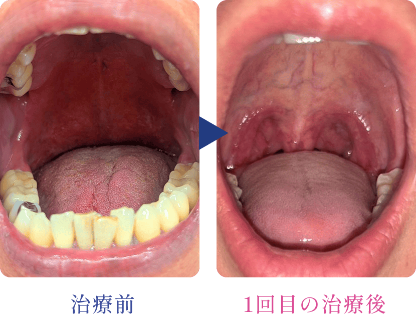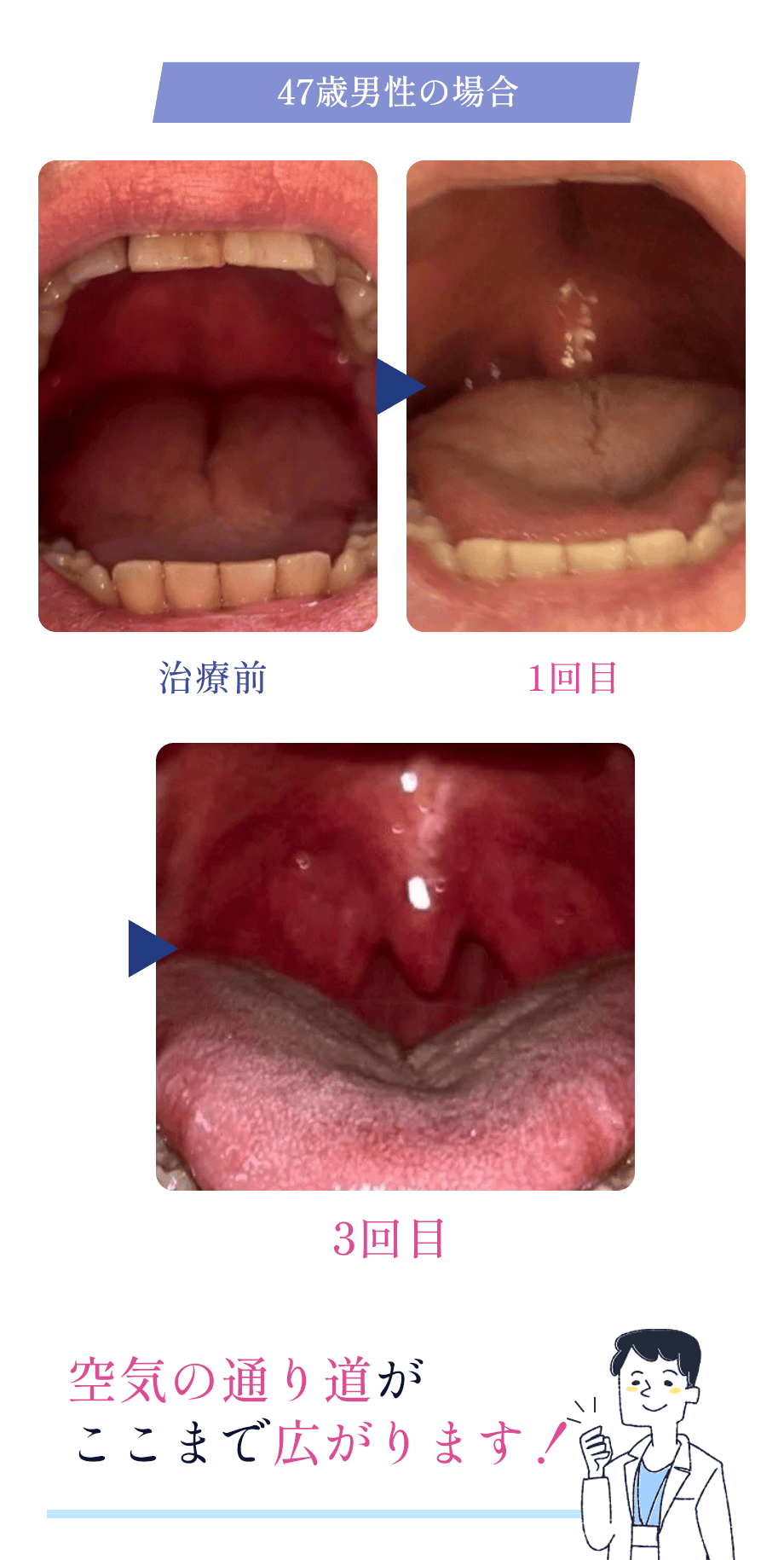 メスで切開するのではなく、最新医療レーザーであるフォトナレーザーを使用し、広がってしまった軟口蓋を引き締めることで空気の通り道を作る施術になります。